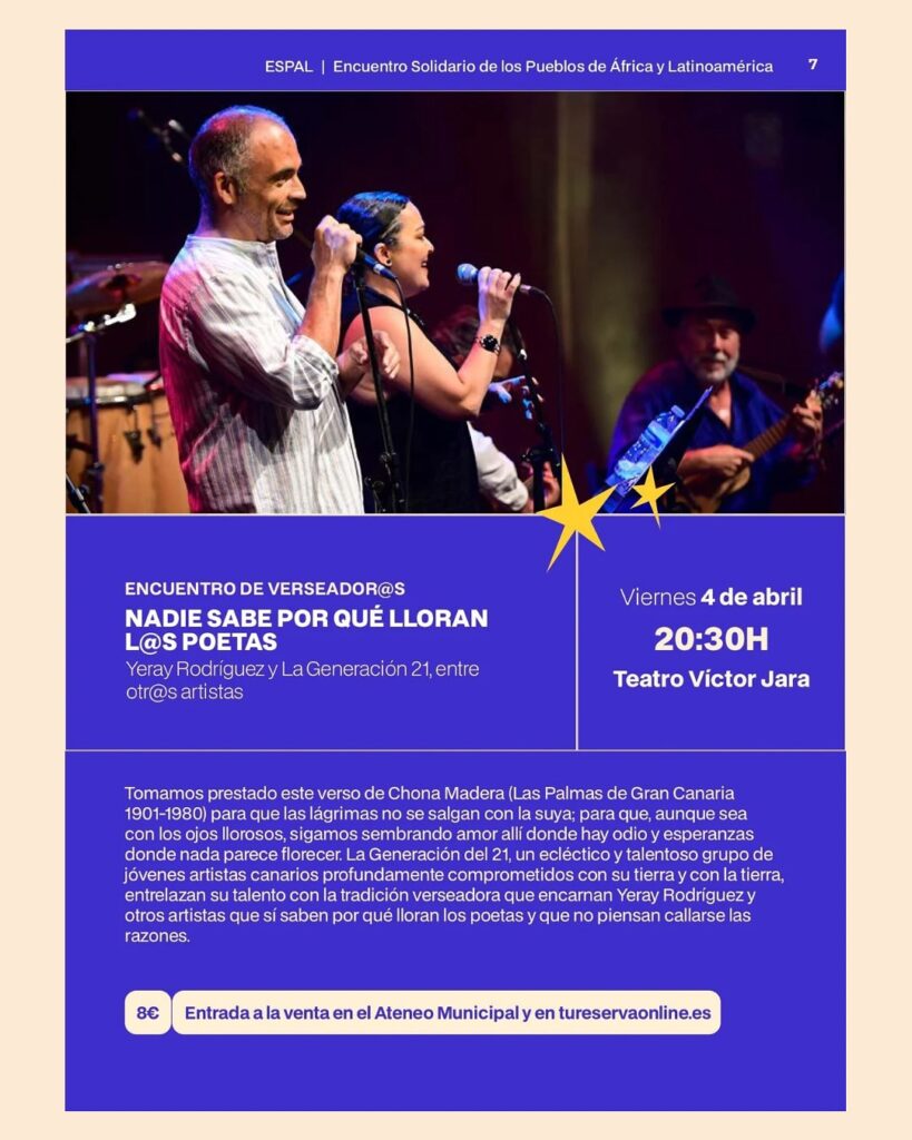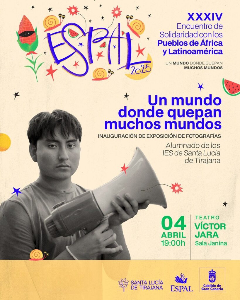 Santa Lucía de Tirajana 3 de abril 2025.- Los versos de Yeray Rodríguez y la Generación 21 abren este viernes el Encuentro de Solidaridad con los Pueblos de África y Latinoamérica (ESPAL), que se celebrará hasta el 12 de abril su edición número 34 con el lema ‘Un mundo donde quepan muchos mundos’. También este viernes se inaugura la exposición de fotografías que tiene por título el lema del ESPAL y está realizada por el alumnado de los institutos de Santa Lucía de Tirajana. La programación del Espal vuelve a incluir el Foro Internacional de Activismo, Derechos Huamnos y Justicia Social, teatro, el humor de ABubukaka, y el Espal en la calle con la Feria del Libro Solidario y conciertos de Flor de Melón, Amebas, Bewis de la Rosa y Lapili entre otros.