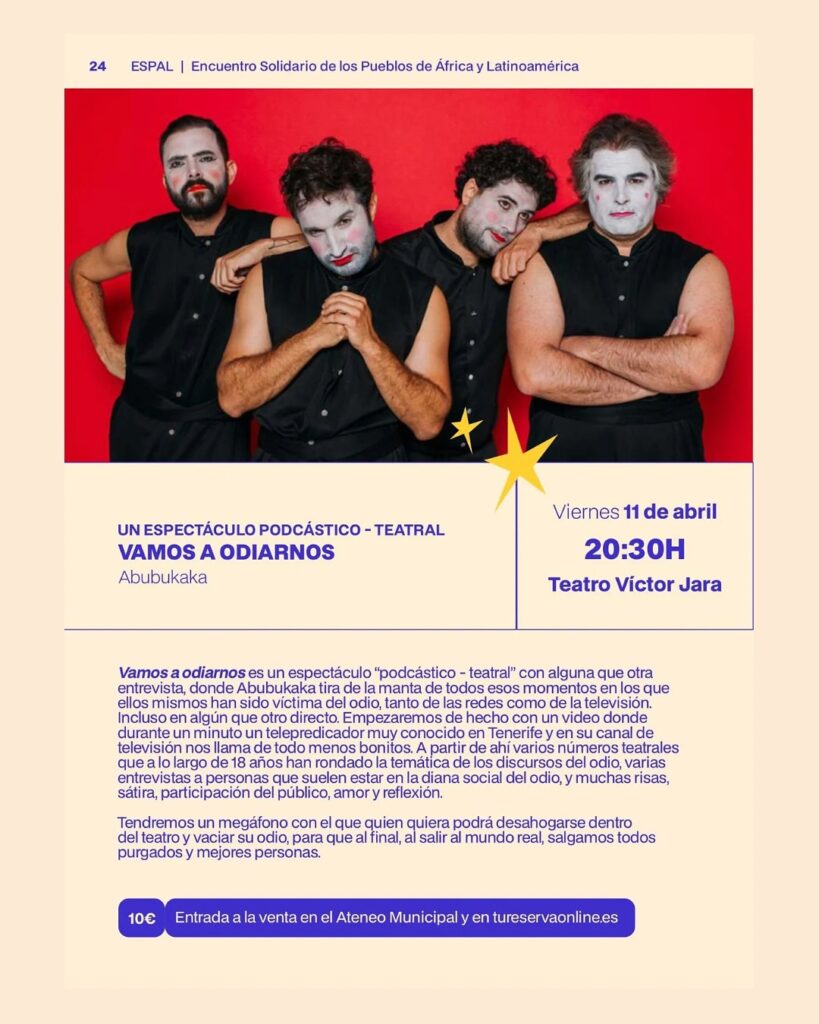 Además del Foro también están programados otros espectáculos en la línea de pensamiento crítico del ESPAL como la perfomance participativa ‘Somos pella de gofio’ de la artista, divulgadora e investigadora Daniasa Curbelo, que tendrá lugar el miércoles 9 de abril a las 17 horas en la sala Janina del teatro Víctor Jara. El jueves 10 de abril a las 19 horas el colectivo La Dupa representará la pieza de creación colectiva ‘La danza que hace llorar a las nubes’, el mismo día a las 20 horas, también en la Casa de la Cultura Saro Bolaños el colectivo Caguama y colectivo Amapolas de Nicaragua ofrecerán el petit cabaret ‘Casarse por papeles es…verdadero amor’. El viernes 11 de abril a las 20.30 Abubukaka ofrecerá el espectáculo podscastico teatral ‘Vamos a odiarnos’.