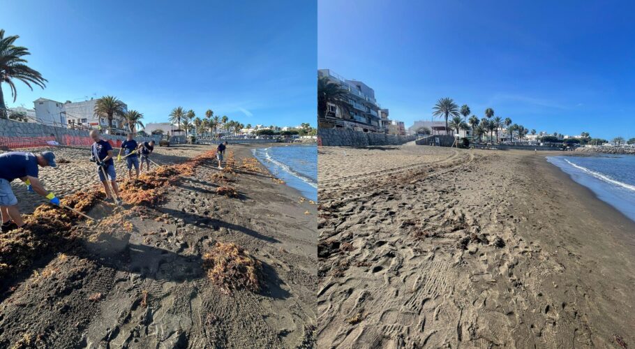 Mogán combate las macroalgas con continuas batidas de limpieza en sus playas