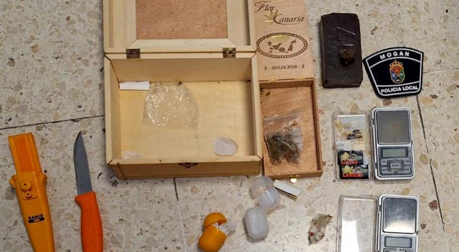 La Policía Local de Mogán ha detenido a un hombre por un delito contra la salud pública por portar hachís, marihuana y otros estupefacientes, así como elementos propios para su distribución. También se le atribuye un delito por amenazas con un cuchillo. La detención tuvo lugar…