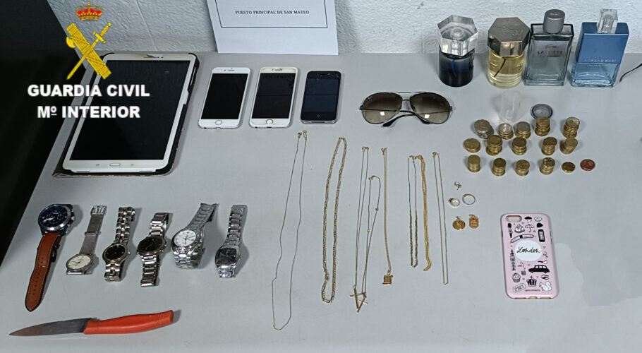 Fruto de la vigilancia preventiva que se realiza en estos residenciales, la Guardia Civil de San Mateo lo interceptó justo después de cometer el hecho delictivo y portaba los objetos sustraídos que fueron recuperados y devueltos a sus legítimos propietarios La Guardia Civil del Puesto Principal…