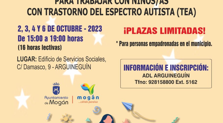La Agencia de Empleo y Desarrollo Local de Mogán (AEDL) pone a disposición de los vecinos y vecinas del municipio cursos de ‘Gobernanta’, ‘Monitores de acogida temprana’ y ‘Monitores de natación’, los dos últimos destinados específicamente para trabajar con menores con trastorno del espectro autista (TEA)….