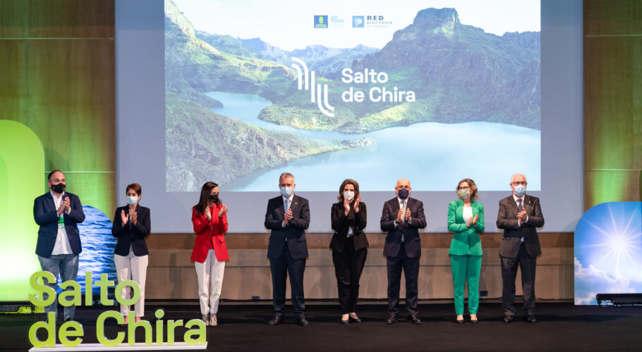 La vicepresidenta tercera del Gobierno y ministra de Transición Ecológica y Reto Demográfico, Teresa Ribera, el presidente de Canarias, Ángel Victor Torres, el presidente del Cabildo de Gran Canaria, Antonio Morales, la presidenta de Red Eléctrica de España, Beatriz Corredor y las alcaldesas de Mogán y…