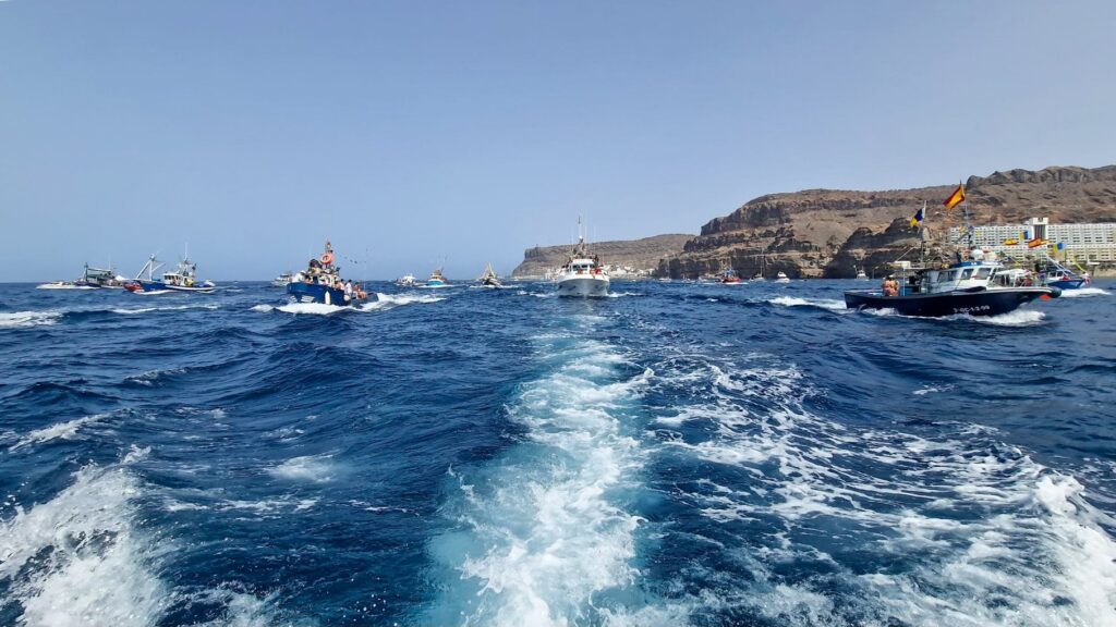 En la velada no faltará la vistosa exhibición de fuegos artificiales desde la avenida de la playa cuando el reloj marque la medianoche, preludio de la esperada procesión marítima de la Virgen del Carmen de Playa de Mogán del domingo día 3 de agosto. El acto comenzará con la solemne eucaristía a las 10:00 horas en la plaza Doctor Pedro Betancor León, desde donde los fieles acompañarán a la imagen de la patrona de los marineros hasta el muelle. Allí embarcará rumbo a Arguineguín junto a una gran comitiva de barcos para el emotivo encuentro con la Virgen del Carmen de la localidad hermana.